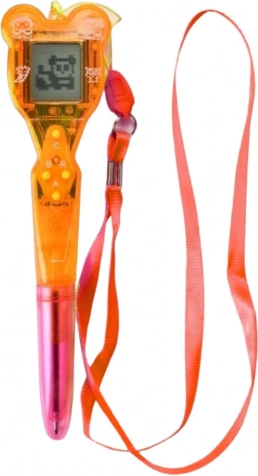 Elektronische pen met 168-in-1 games, blauwe inkt, nekkoord en batterijen inbegrepen. Plezier en schrijven, altijd en overal. In roze-oranje uitvoering.