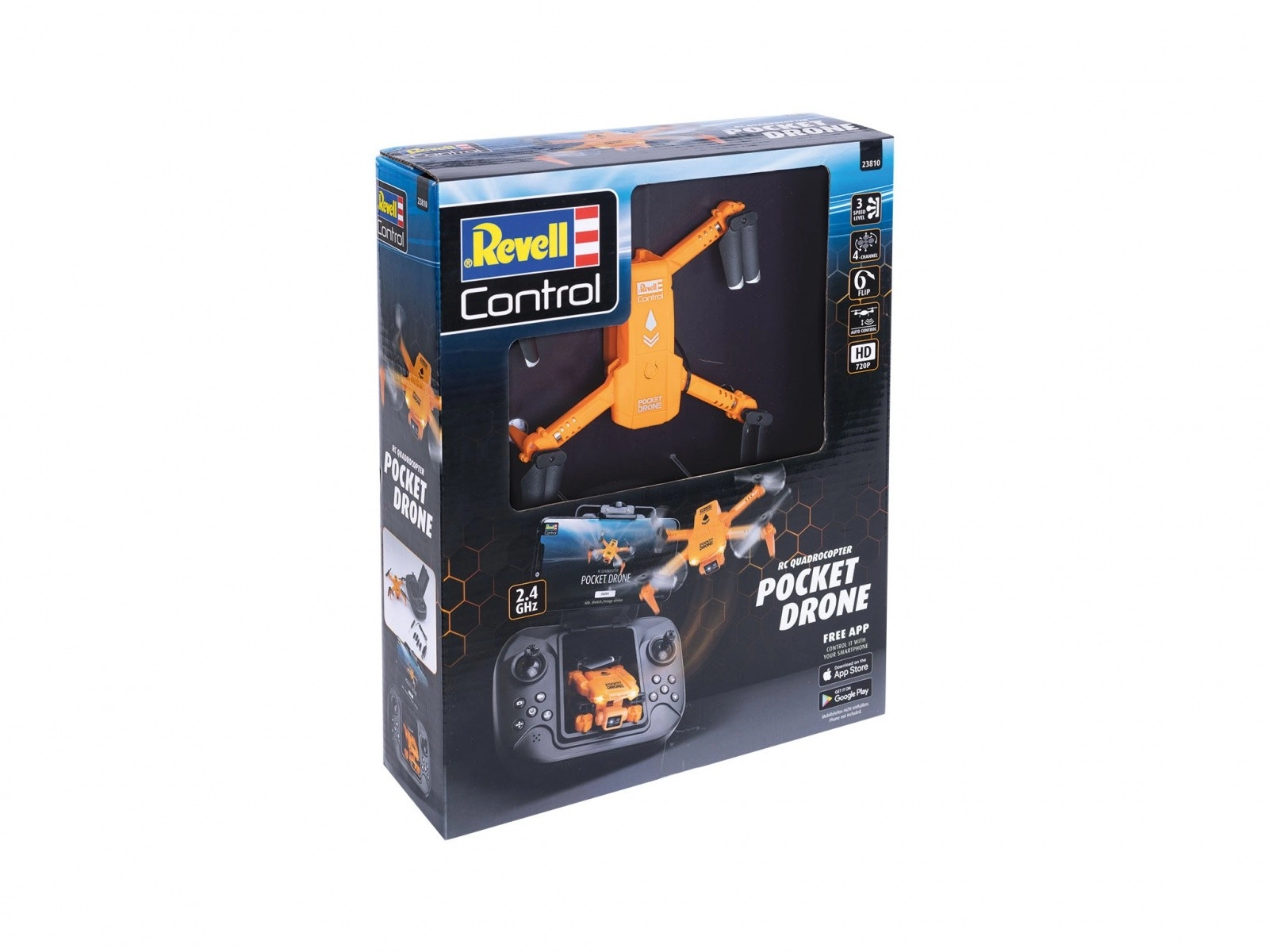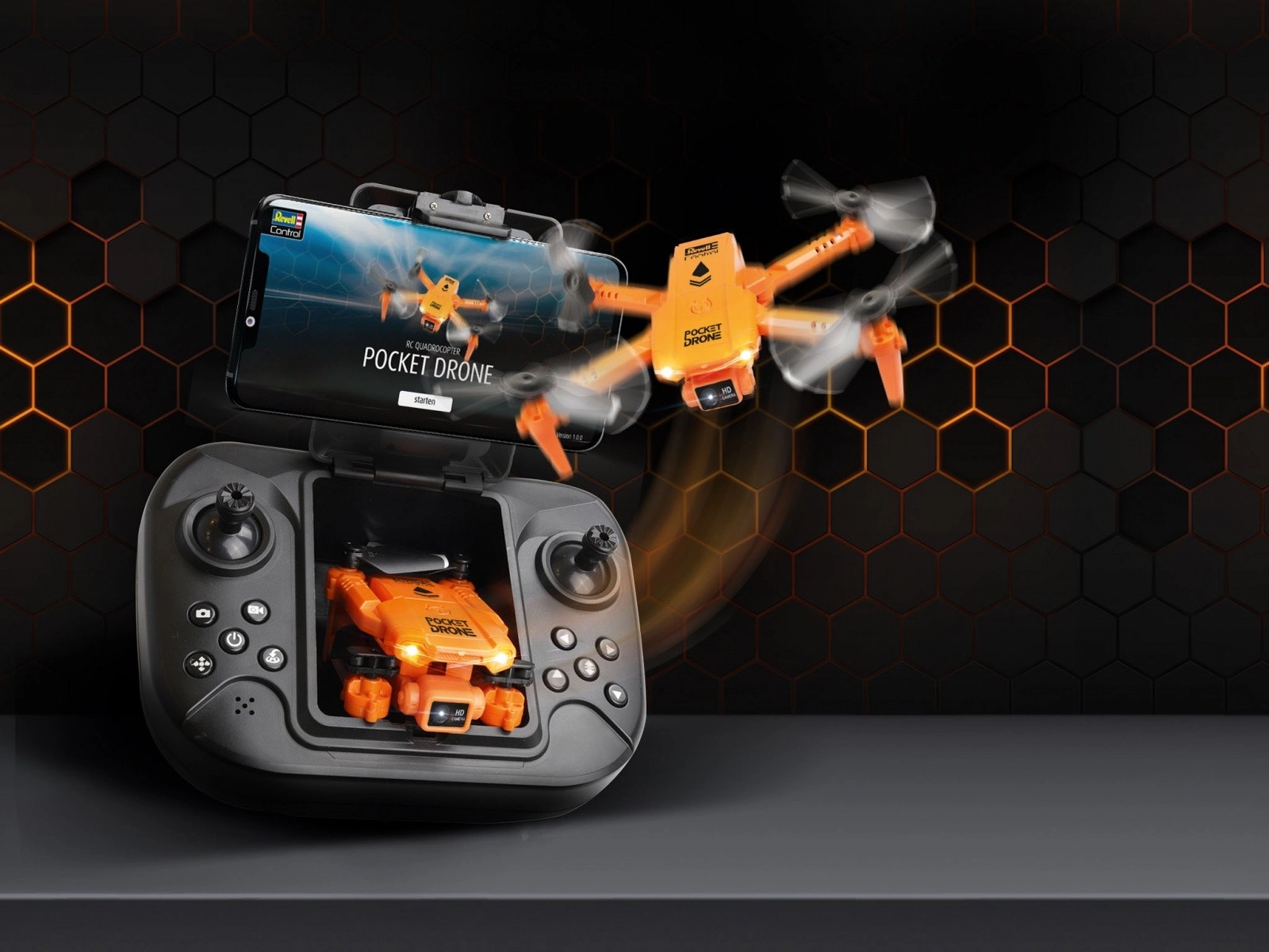 De zakformaatdrone REVELL Control levert groot plezier in een klein formaat. Met een lengte van 110 mm, breedte van 134 mm en hoogte van 35 mm past hij gemakkelijk in het vak van de controller en is hij altijd klaar om te vliegen. De ingebouwde 720p-camera streamt basisfoto’s en -video’s live naar je smartphone, zodat je de wereld vanuit een nieuw perspectief ziet.