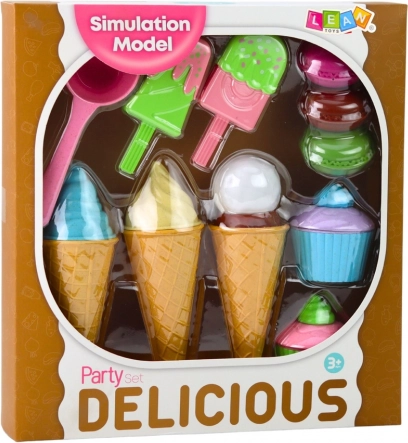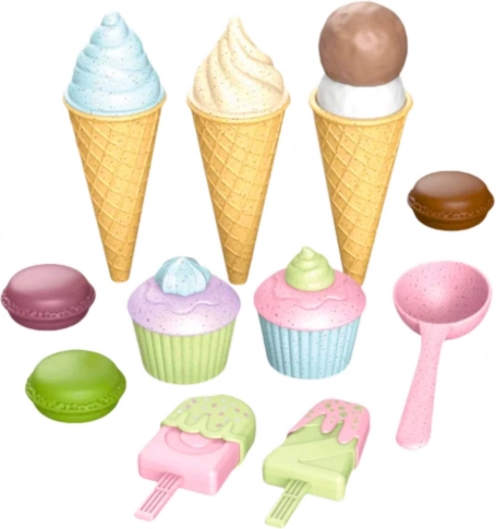 Een kleurrijke set met ijsjes en desserts die alle kleine patissiers zal bekoren. Bevat hoorntjes, ijslolly’s, cupcakes, macarons en een ijslepel – alles van veilig plastic. Stimuleert creativiteit, fijne motoriek en rollenspel in een patisserie of ijssalon.