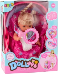 Een schattige babypop in een draagzak die elk kind zal verrassen met realistische functies. De pop praat en brabbelt (zegt “mama” en “papa” in het Engels), na het drinken uit het flesje plast ze, heeft beweeglijke ledematen en afneembare kleding. Inclusief draagzak met dekentje, flesje en speen aan een kettinkje – een perfect cadeau in geschenkverpakking.