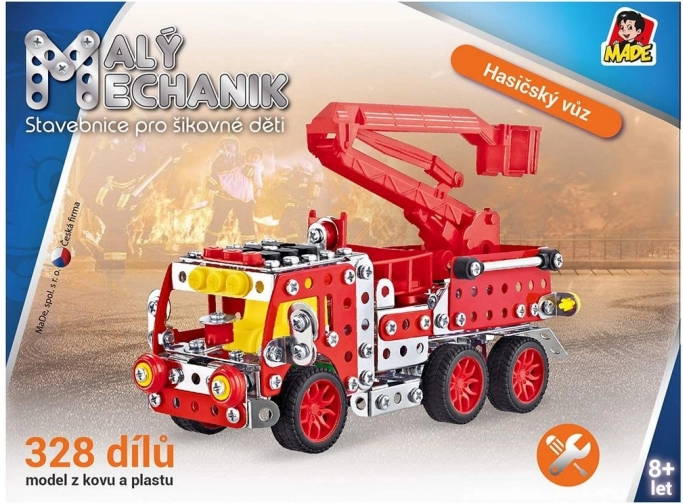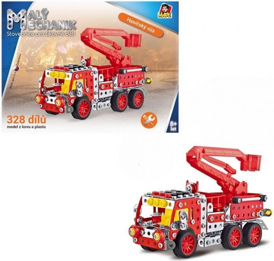 Bouwset Kleine Mechanicus: brandweerwagen met platform, 327 stuks. Ontwikkelt motoriek, creativiteit en probleemoplossing. Metaal en kunststof, voor kinderen vanaf 8 jaar.