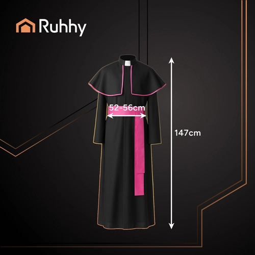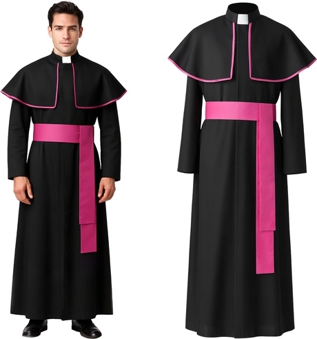 Klassiek geestelijkenkostuum met een lange soutane, schoudermanteltje met kol en een paarse ceintuur; een kant-en-klare verkleedoutfit, ideaal voor Halloween, carnaval, cosplay en theatervoorstellingen. De ruime snit in universele maat XL/XXL zorgt voor comfort en gemakkelijk aankleden, terwijl het realistische uiterlijk de aandacht trekt op elk evenement.