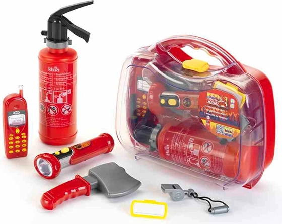 Complete reddingsspelset voor kleine helden! Dit brandweer-koffertje bevat alles voor een spannend avontuur: werkende brandblusser met sproeifunctie, mobiele telefoon, bijl, naamplaatje, fluitje en zaklamp.