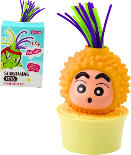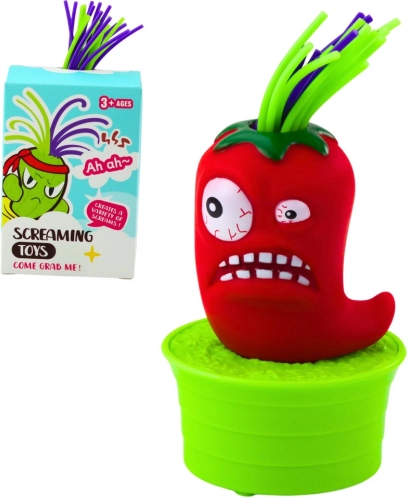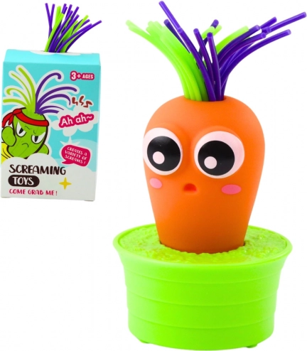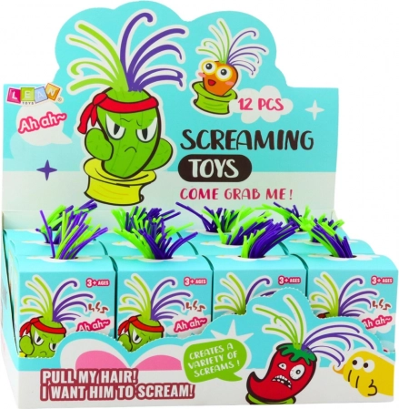 Interactieve figuur Schreeuwende groente met gekleurde haartjes. Trek en hoor grappige kreten! Licht, veilig, ideaal als cadeau. Mix van motieven, per 1 stuk verkocht.