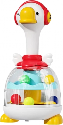 Dit leuke en educatieve speelgoed combineert eenvoudige bediening met rijke zintuiglijke prikkels. Door op de kop van de gans te drukken, start het draaimechanisme dat de gekleurde kogeltjes onder de transparante koepel in beweging zet. Aantrekkelijke lichteffecten en geluidseffecten houden de aandacht vast en prikkelen de natuurlijke nieuwsgierigheid van het kind.