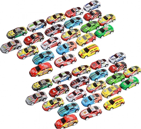 Grote set van 48 mini-autootjes met pull-back aandrijving in een praktische container-koffertje voor eenvoudig meenemen en opbergen. Autootjes in 5 verschillende stijlen en vrolijke kleuren zullen kleine autoliefhebbers blij maken. Dankzij het batterijloze mechanisme hoef je het autootje alleen maar naar achteren te trekken en los te laten – en het schiet direct naar voren. Compacte afmetingen passen perfect in kinderhanden; de veilige afwerking met afgeronde randen zorgt voor zorgeloos spelen thuis en onderweg.