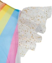 De betoverende set voor kleine fantasyliefhebbers bevat alles voor een directe transformatie – een glinsterend rokje met sterretjes, gouden vleugels met elastiek en een diadeem met oren, manen en hoorn. Dankzij het eenvoudige aantrekken over het hoofd en de elastische elementen is het kostuum snel klaar voor plezier zonder ingewikkelde sluitingen.