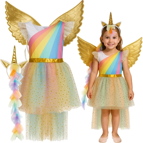 Schattig kinderkostuum eenhoorn in maat 122–128 cm tovert elke kleine prinses om tot een magisch wezen. Het omvat een rokje met een glinsterende tulelaag, gouden vleugels en een diadeem met hoorn. Het kostuum is licht en comfortabel om over het hoofd aan te trekken, ideaal voor carnaval, Halloween, feestjes en schooloptredens en kan in de wasmachine op 30 °C gewassen worden. Certificering volgens Europese normen zorgt voor veilig gebruik.