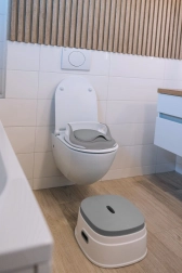 De set bevat een uitneembare binnenkom voor snel en eenvoudig schoonmaken, een afneembare toiletverkleiner voor gebruik op standaardtoiletten en een praktisch opstapje met zijhandgrepen, dat het kind helpt de wasbak of hogere plekken te bereiken.