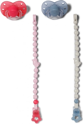 De fopspeen zit vast aan een clip/ketting die je eenvoudig aan de kleding van de pop bevestigt. Zo is hij altijd bij de hand en raakt hij niet kwijt tijdens het spelen.