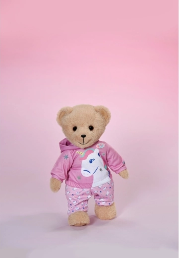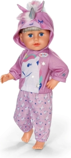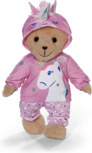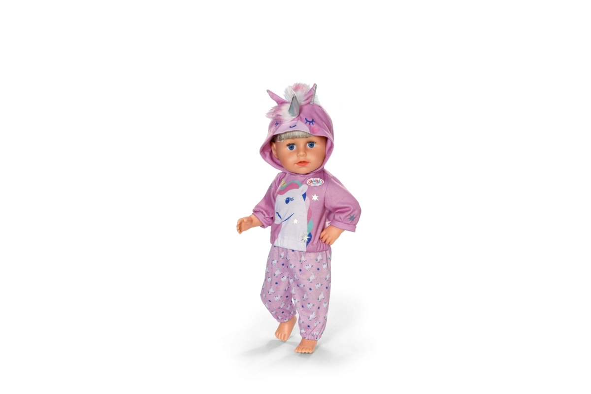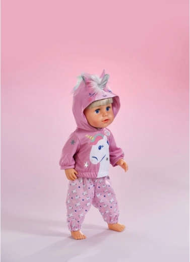 Een stijlvolle eenhoornoutfit verandert elke pop in een sprookjesachtige vriend. De zachte hoodie met capuchon met hoorn en oortjes en de bijpassende broek met eenhoornprint stimuleren creatief spel, verhalen vertellen en de fijne motoriek dankzij het eenvoudige omkleden.