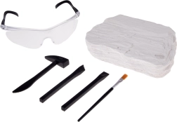 De set bevat 2 beitels, een hamertje, een kwastje en een veiligheidsbril. Kinderen kunnen veilig opgraven, schoonmaken en de verborgen schat onthullen als echte onderzoekers.
