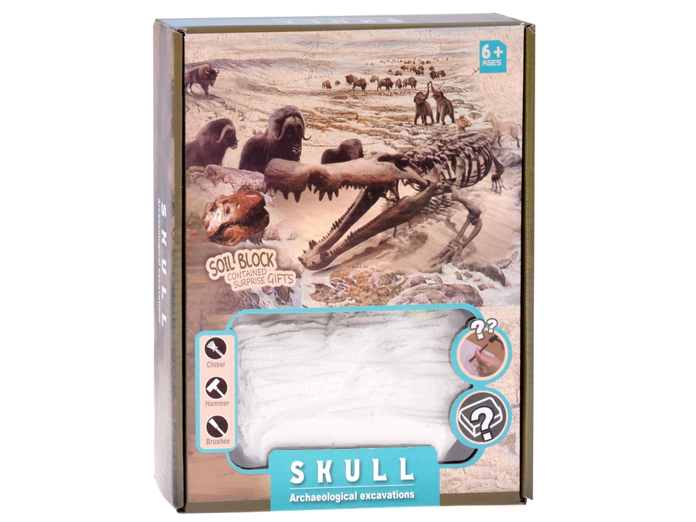 Word een kleine archeoloog en ontdek wat er verborgen zit in het gipsblok! In deze leuke en leerzame set vind je alles wat je nodig hebt voor veilig opgraven – beitels, een hamertje, een kwastje en een veiligheidsbril. Binnenin wacht een willekeurige fossiele schedel van dieren en prehistorische wezens. Realistische tools, een zacht gipsblok en educatief spel ondersteunen geduld, concentratie en fijne motoriek.