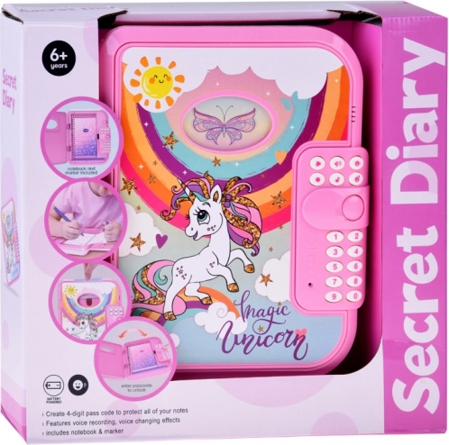 Interactief geheim dagboek met code en eenhoorn: 6 knoppen, spraakopname, stemverandering, 10 melodieën, verborgen vakje. Ideaal voor kindergeheimen.