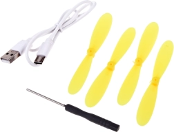 - Accu 3,7 V 500 mAh – tot 10 minuten vliegtijd, opladen ca. 60 minuten