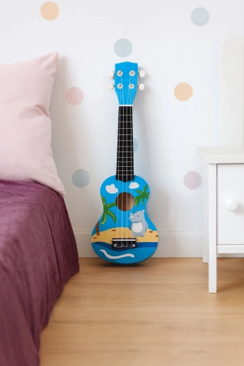 De hals met 12 frets en een betrouwbare kop met 4 stemknoppen maken zuiver stemmen en comfortabel spelen mogelijk vanaf de eerste pogingen. De kleurrijke grafische eilandprint motiveert kinderen om regelmatig te spelen en vergroot het plezier in het ontdekken van muziek – thuis, op de peuterspeelzaal of bij familieoptredens.