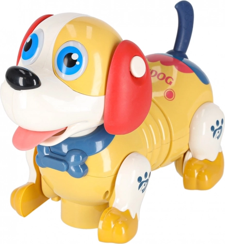 De hond beweegt schattig zijwaarts, zijn ogen lichten op en het spel wordt begeleid door muziek. Plezier dat zintuigen en coördinatie ontwikkelt.