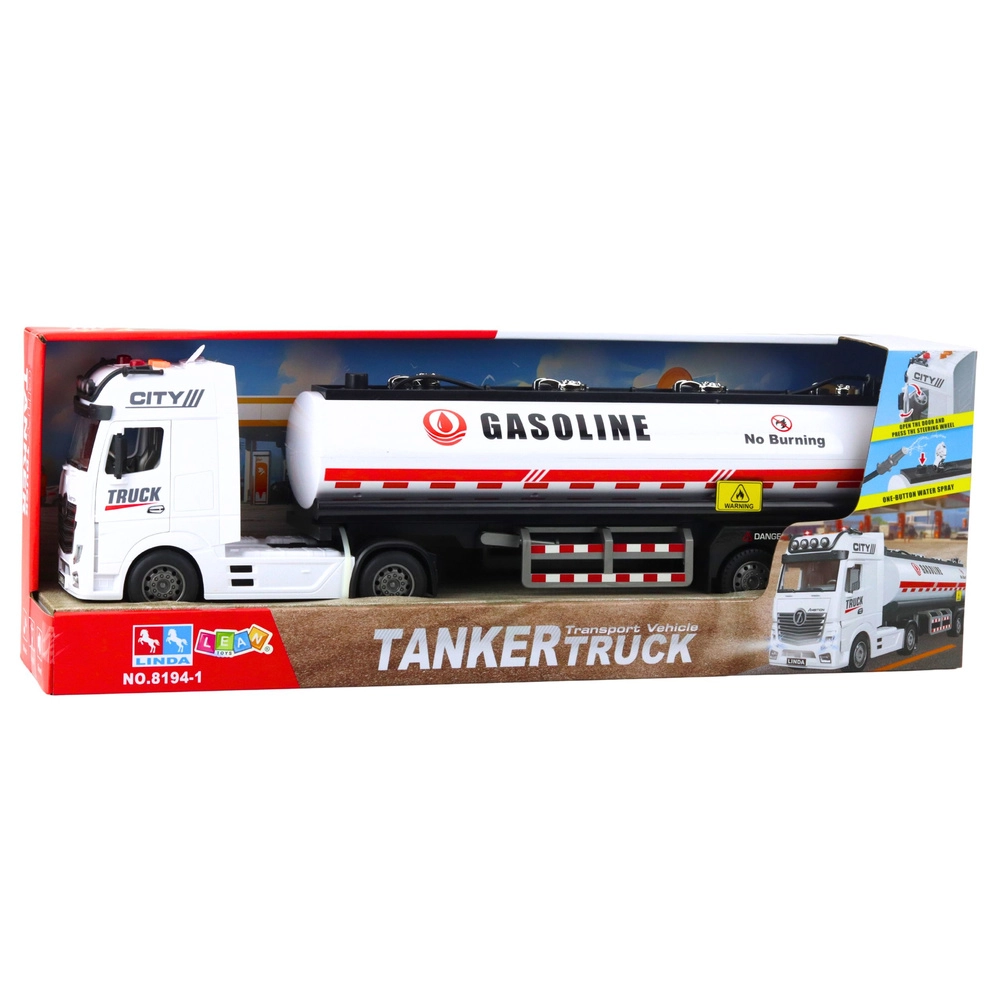 Realistische tankwagenset van 57 cm lang die kinderen uren speelplezier biedt. Voorzien van waterpomp- en gietfunctie, afkoppelbare aanhanger, openende cabinedeuren en licht- en geluidseffecten. De robuuste afwerking zorgt voor duurzaamheid en veilig gebruik en stimuleert de ontwikkeling van fantasie en motorische vaardigheden.