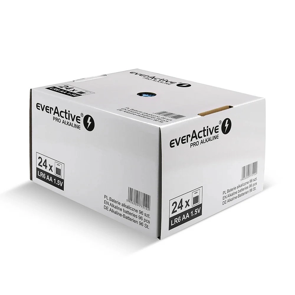 De everActive PRO Alkaline set brengt de krachtigste reeks alkaline batterijen van het merk everActive in een praktische displayverpakking – 24 blisters met 4 stuks, in totaal 96 AA (LR6) batterijen. Ideaal voor retail, servicecentra, bedrijven en professioneel gebruik.