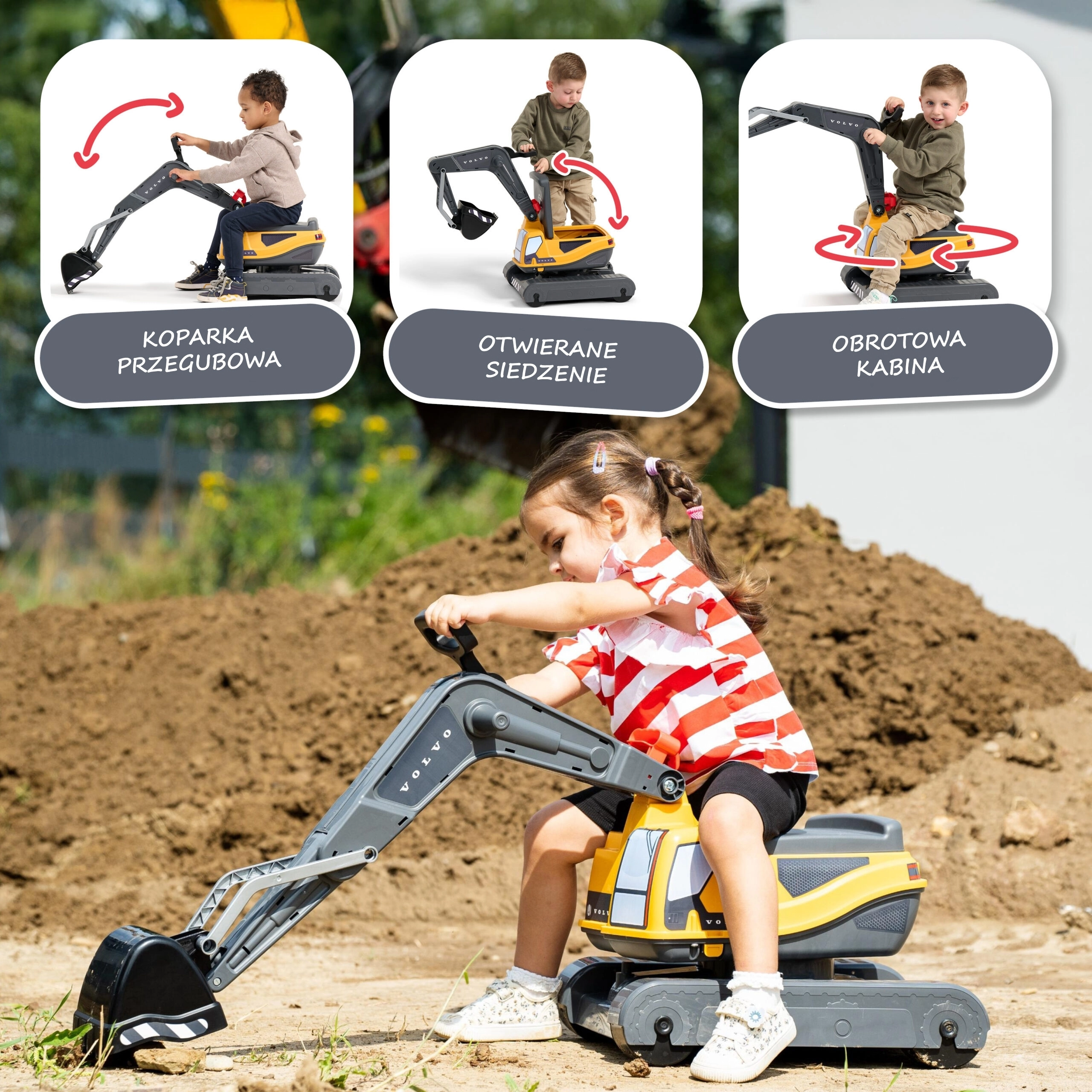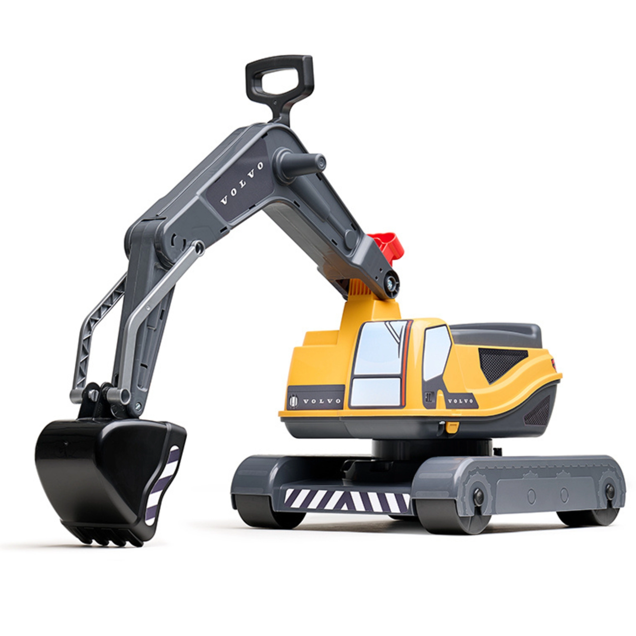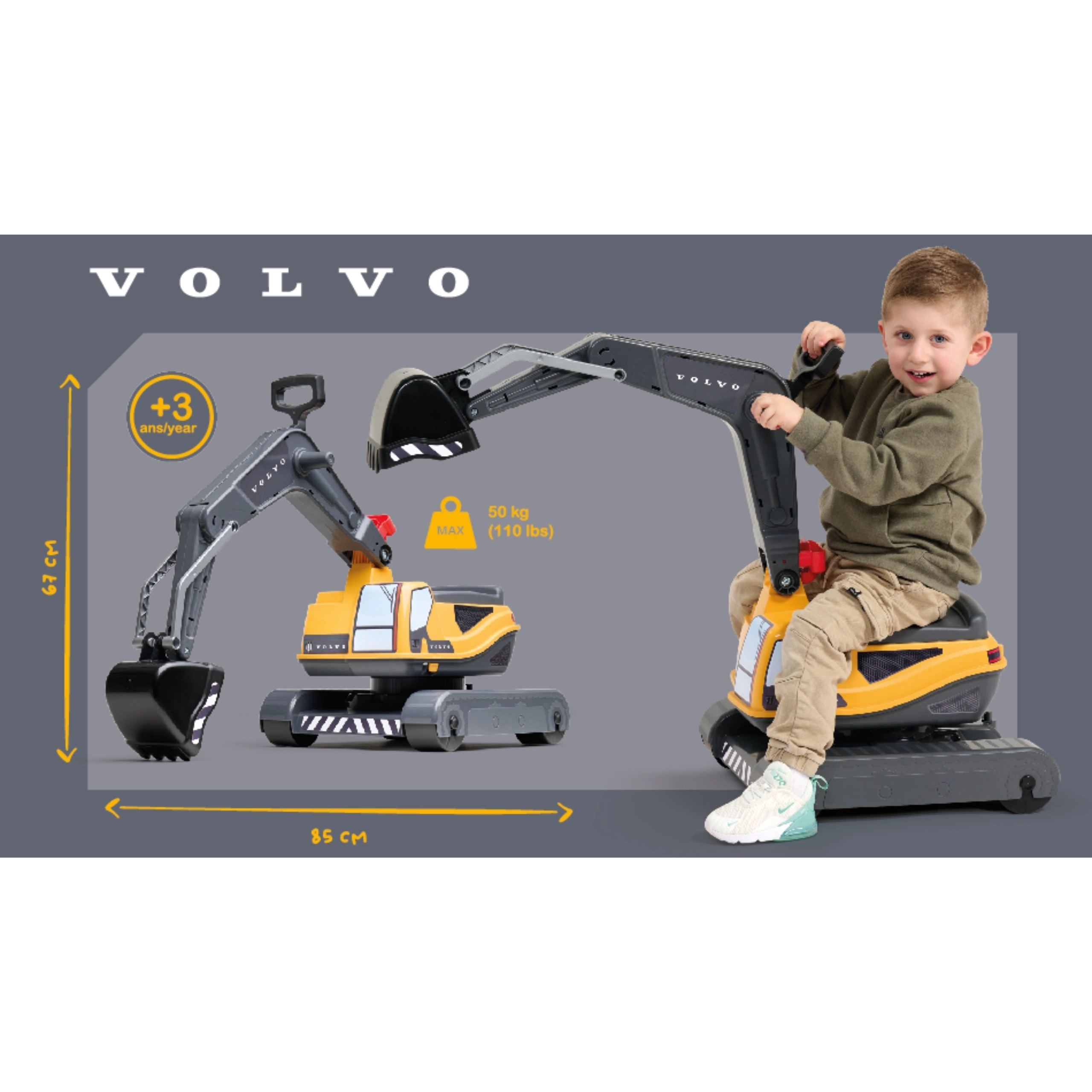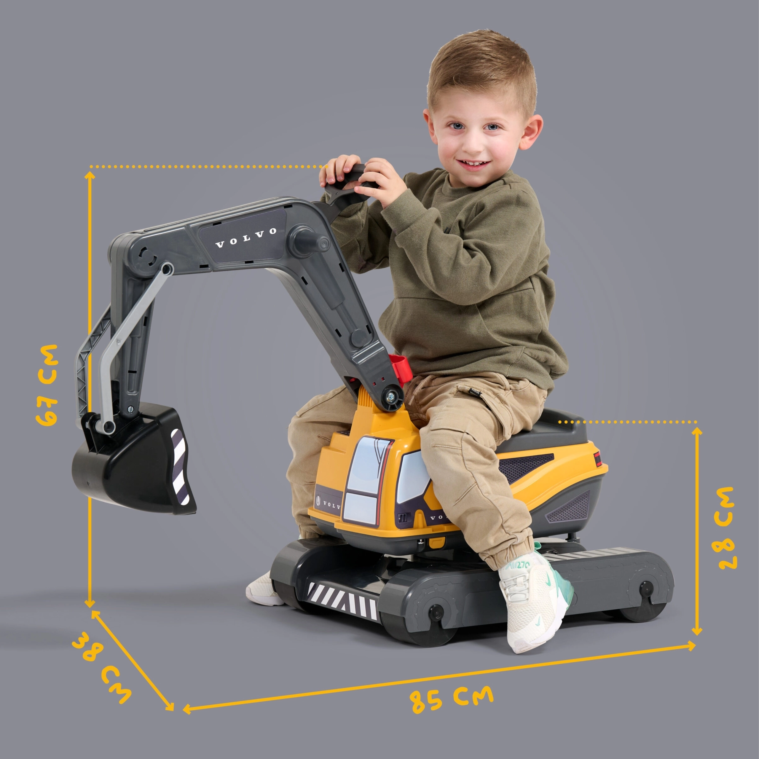 Deze VOLVO graafmachine op wielen voor kinderen lijkt sterk op een echte machine en biedt een robuuste constructie voor veilig en langdurig speelplezier. De cabine draait 360°, zodat het kind kan graven en materiaal kan lossen zonder het voertuig te verplaatsen. De openslaande zitting verbergt een praktische opbergruimte voor kleine spulletjes.