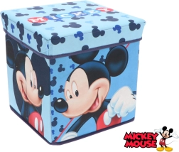 Stijlvolle en praktische opbergbox met gelicenseerd motief van MICKEY MOUSE, die ook dienstdoet als comfortabele poef. Dankzij de opvouwbare constructie bespaar je ruimte, hij heeft een stevig deksel met een draagvermogen tot 80 kg en is ideaal voor de kinderkamer, speelkamer of badkamer. Het standaard formaat 30 × 30 × 30 cm past in de meeste organizers.