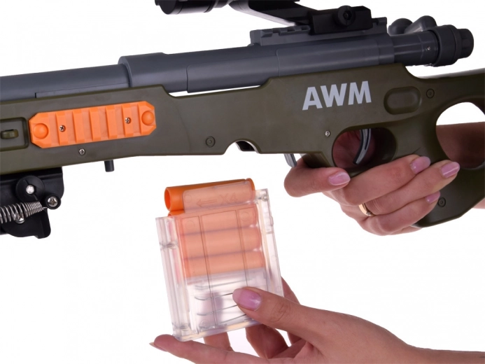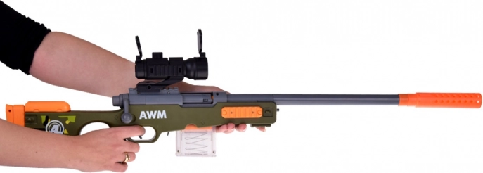 Groot kindersluipschuttersgeweer voor foam munitie met optiek, magazijn en uitwerpende “hulzen”. Licht, zonder batterijen, veilig en leuk speelplezier voor kinderen.