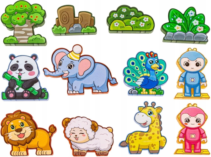- Diverse onderdelen: magnetische vormen, dierenfiguren en personages, thematische accessoires (boom, rotsen).