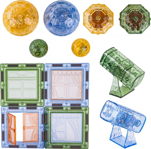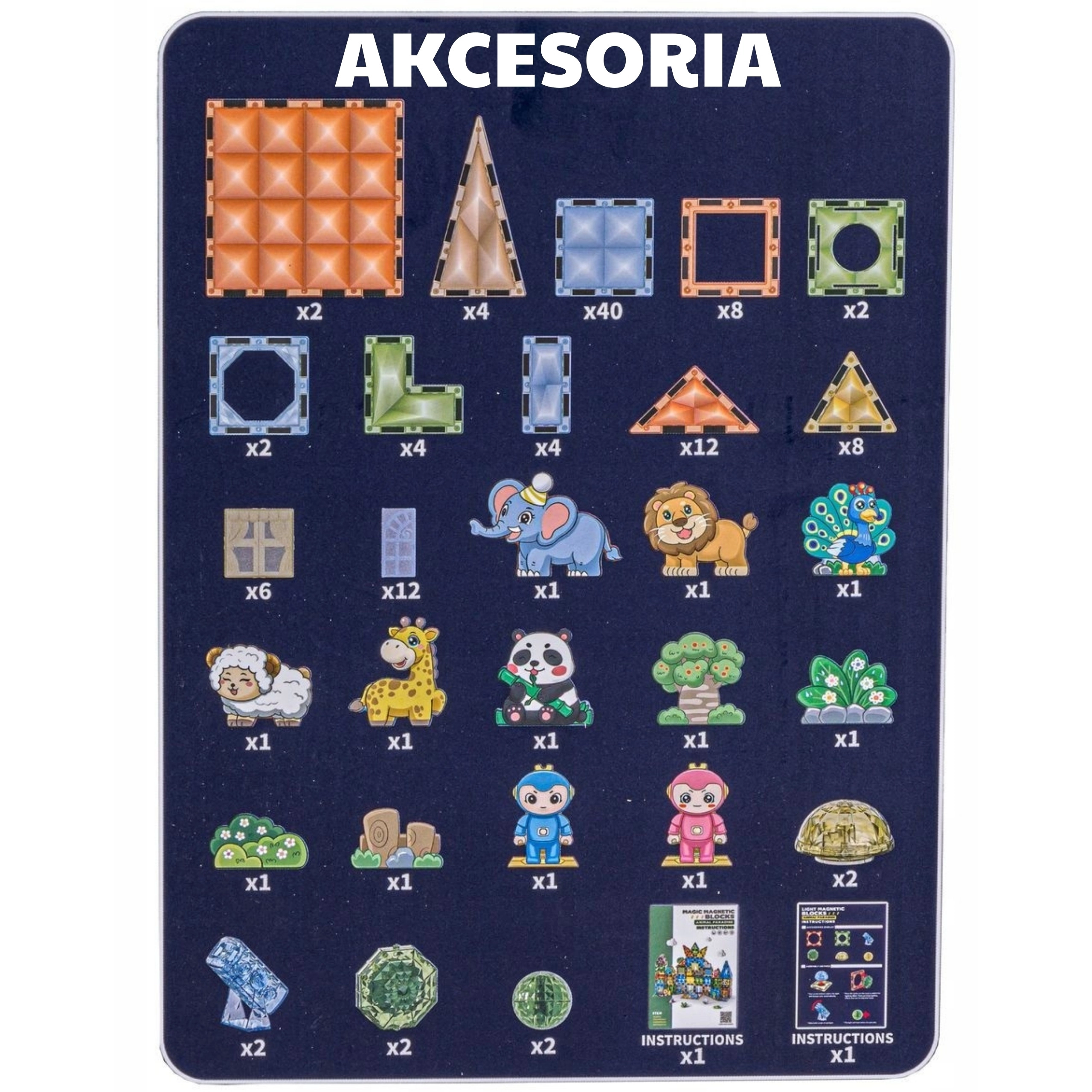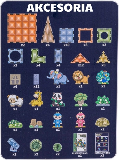 - Magnetische onderdelen in diverse vormen, dierenfiguren, personagefiguren, thematische accessoires (boom, rotsen), handleiding