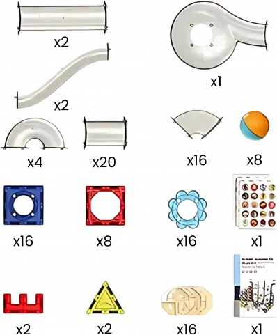 - Magnetische delen in diverse vormen en kleuren; transparante baandelen (goten, bochten, trechters, tunnels); gekleurde knikkers; decoratieve stickers; geïllustreerde handleiding