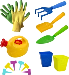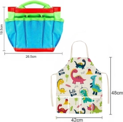 - gieter in de vorm van een bloem, tuinhandschoenen, schepje, schop/schep, hark, 2 bloempotjes (oranje en geel), 6 gekleurde plantenlabels, gereedschapstas, beschermschort met dinosaurussen