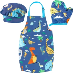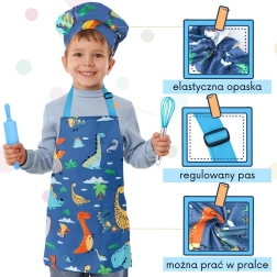 Prikkel de kinderfantasie in de keuken met een schattig dino-motief. De set is gemaakt van hoogwaardige, voedselveilige materialen, de siliconen onderdelen zijn eenvoudig te reinigen en schort en muts zijn machinewasbaar. Dankzij de verstelbare band en de elastische boord past hij perfect voor kinderen van verschillende leeftijden.