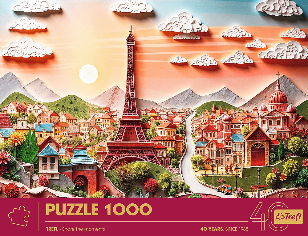Ontdek de charme van de Franse metropool met de Trefl-puzzel in de originele Paper Art-benadering. Dankzij 1000 nauwkeurig uitgesneden stukjes geniet je van soepel leggen, diepe kleuren en scherpe details van het motief. Het voltooide beeld met een grootte van circa 68,3 × 48 cm is perfect om in te lijsten en als interieurdecoratie.