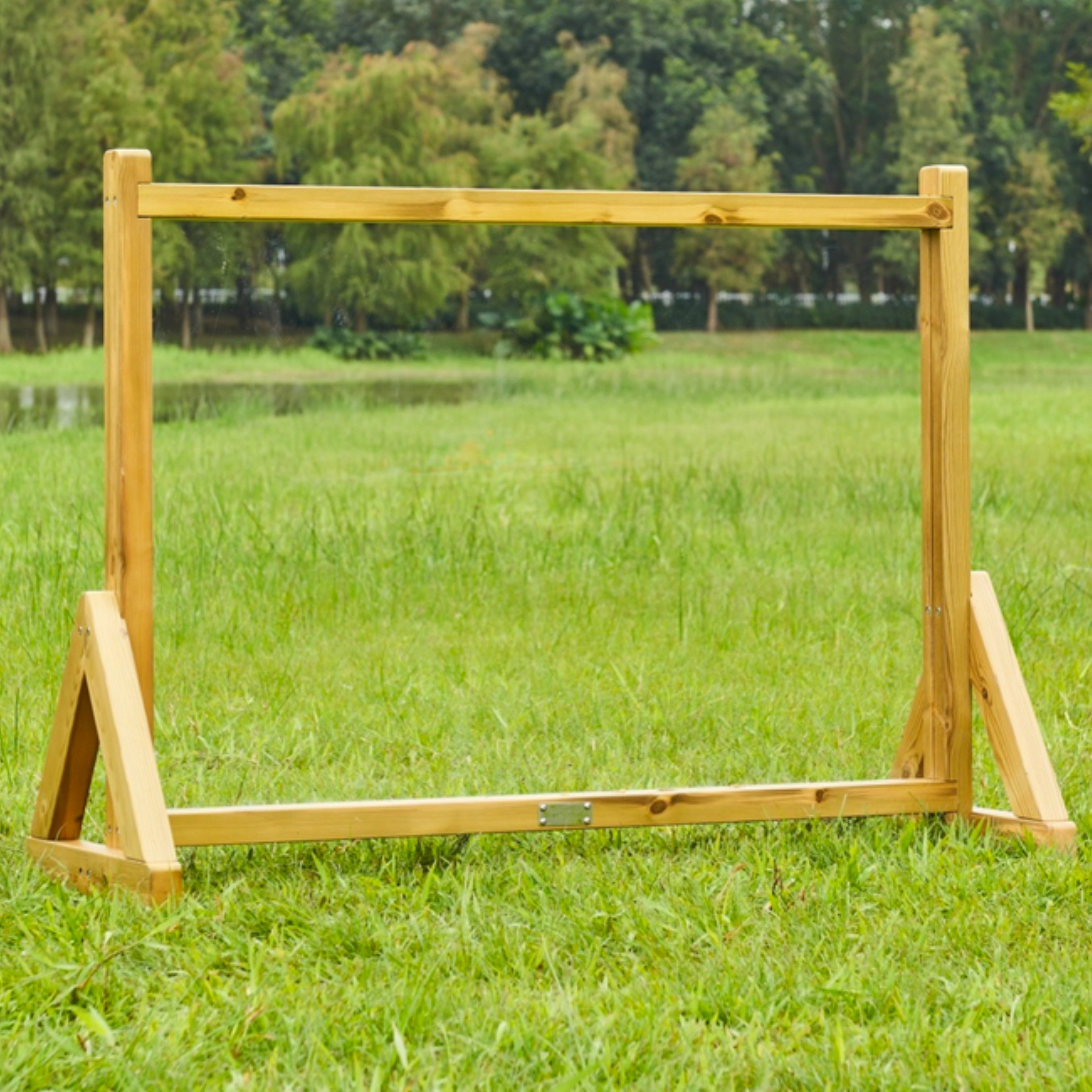 Het vrijstaande A-frame met verstevigingen houdt het bord stevig op zijn plaats op gras en harde ondergrond en is klaar voor onmiddellijk gebruik.
