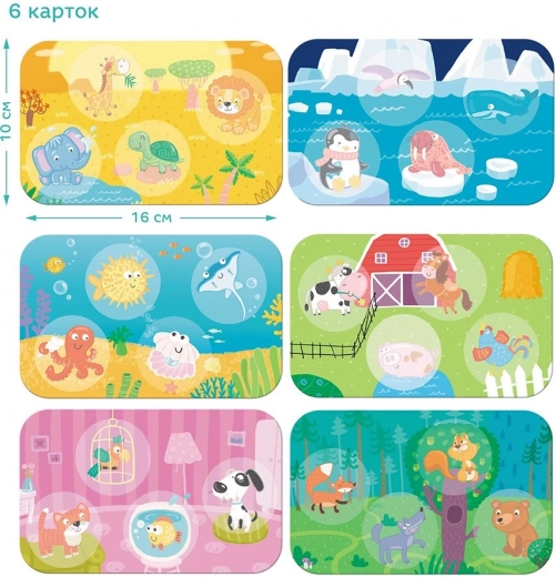 Kinderlottospel – Dieren en hun woningen. Leren door te spelen: dieren aan hun thuis koppelen, ontwikkeling van geheugen en motoriek. 6 kaarten, 24 fiches, leeftijd 3+.