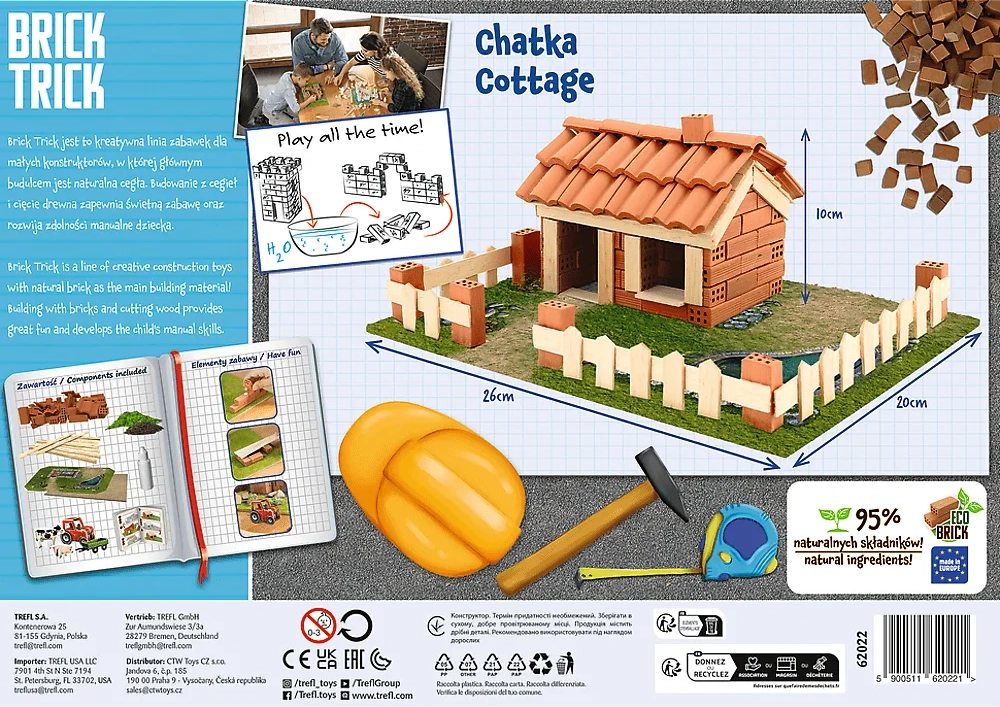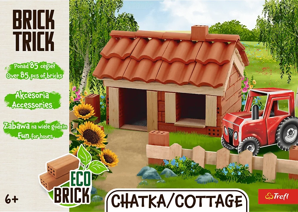 Ontdek de bouwset Trefl Brick Trick Eco Chata, waarmee kinderen stap voor stap kunnen bouwen van de fundering tot het voltooide model met dak, hek en erf. Echte mini baksteentjes, hout en decoratieve accessoires zorgen voor de authentieke look van een klein landelijk huisje. Breng het voltooide bouwwerk tot leven met papieren figuren en thematische accessoires.