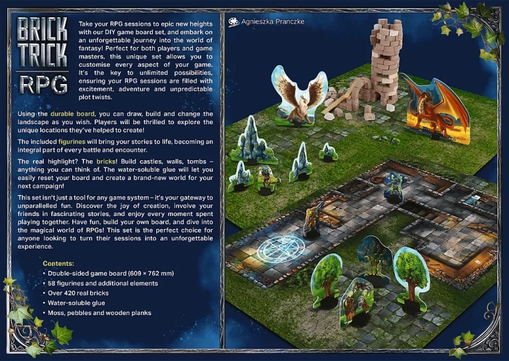 Ontdek de bouwset Trefl Brick Trick RPG: vergeten erfenis, die RPG-avonturen combineert met echte bakstenen en in water oplosbare lijm voor herhaald bouwen. Creëer kastelen, ruïnes, kerkers en andere omgevingen voor indrukwekkende speelscènes, ontwikkel creativiteit, tactisch denken en bereid onvergetelijke decors voor elke RPG-campagne.