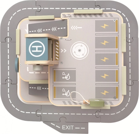 In de verpakking vind je alles voor direct speelplezier – vier autootjes, een helikopter, drie verkeersborden, een autowasstraat en twee tankstations, waarvan één dient als laadpaal voor elektrische auto’s. De veilige afwerking van hout en de duurzame constructie garanderen een lange levensduur, zelfs bij dagelijks spelen.