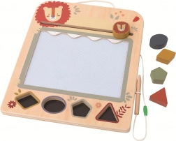 Dit kwalitatieve houten magnetische tekenbord met een schattig leeuwtje zal kleine kunstenaars enthousiast maken. De magnetische pen, vastgemaakt met een koordje, raakt niet kwijt en kinderen kunnen veilig tekeningen, vormen en hun eerste lettertjes maken. De wis-schuifknop met leeuwtjesmotief zorgt voor het snel wissen van de hele tekening met één beweging.