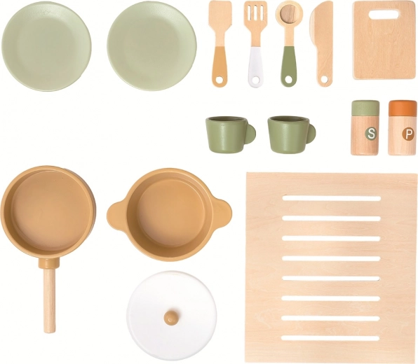 Inclusief een uitgebreide set accessoires: borden, bekers, pan, pot met deksel, zout en peper, snijplank, keukengerei en een ovenrooster. De constructie van massief hout en niet-giftige verven garandeert veiligheid en een lange levensduur.