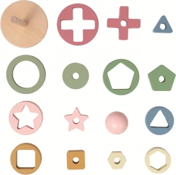 Kinderen schuiven ringen in verschillende groottes op een houten staaf, waarbij elke ring in het midden een uitsparing heeft – een sterretje, vierkant, driehoek en meer vormen. Wanneer alle onderdelen correct zijn geplaatst, wordt het ronde hoofdje erop gezet en is het popje compleet. Het spel stimuleert op natuurlijke wijze concentratie, geduld en plezier in ontdekken.