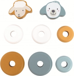Deze houten balansspeelset biedt leuk stapelen met gekleurde ringen en dierenkopjes op twee staven. Het platform kantelt bij elke beweging en kinderen ontdekken hoe ze het schaapje en het hondje zo kunnen rangschikken dat alles in evenwicht blijft. Tijdens het spel ontwikkelen ze geduld, logisch denken en een goed gevoel voor balans.