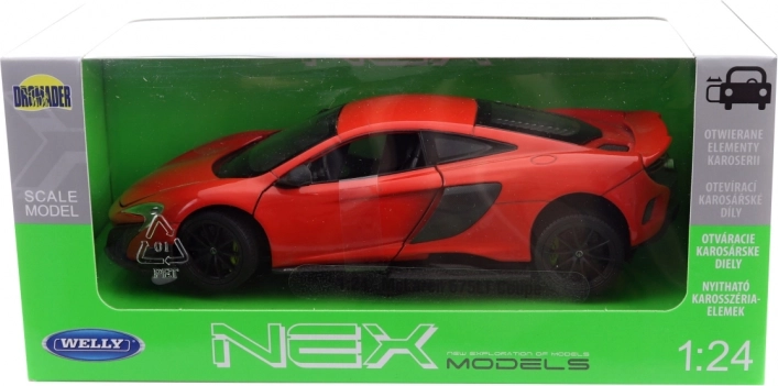 Gedetailleerd uitgewerkt model van metaal en kunststof van de McLaren 675LT op schaal 1:24 dat elke supercar-fan zal verheugen. Het biedt te openen carrosseriedelen en is gespoten met originele autolak voor een realistische uitstraling. Ideaal als verzamelobject of cadeau voor kinderen vanaf 8 jaar.