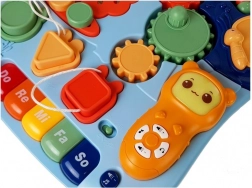 Draaibare tandwielen, schuifjes, vormen aan koordjes en drukknoppen trainen grijpen, oog-handcoördinatie en logisch denken.