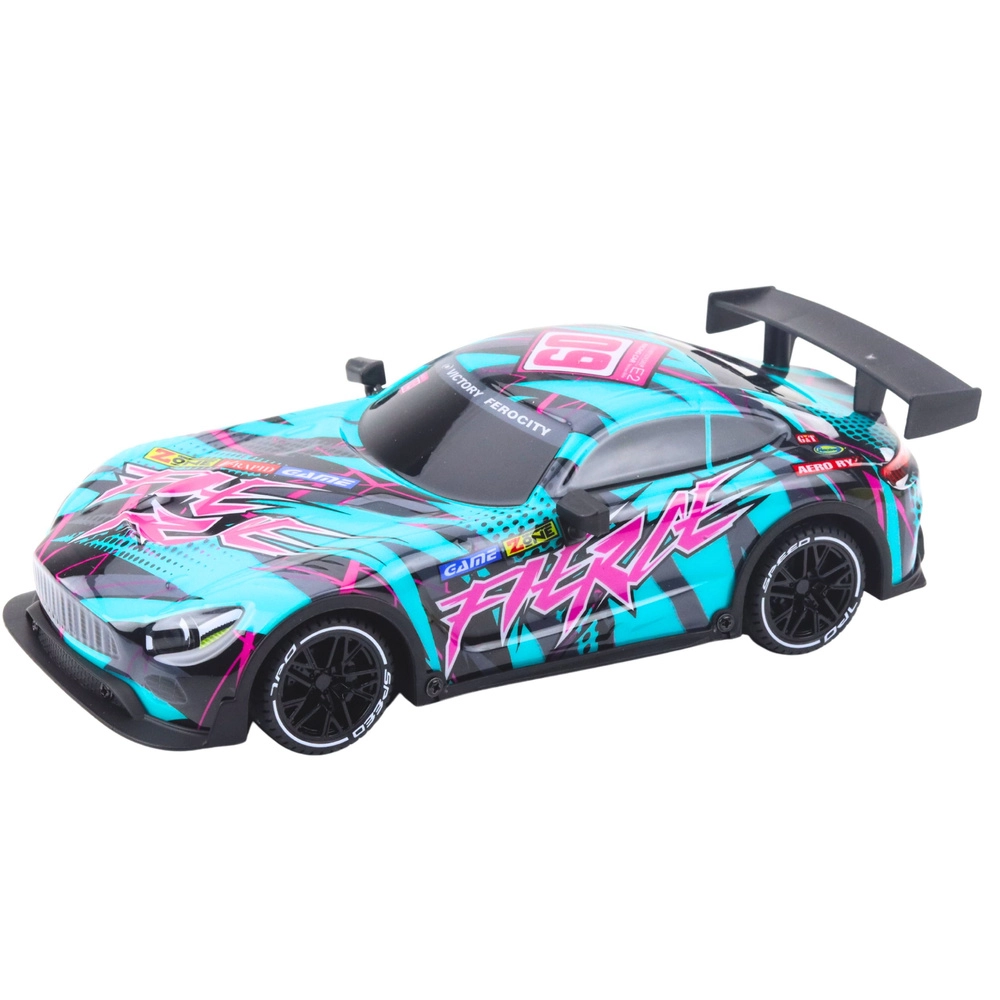 Leuk en gemakkelijk te bedienen RC-raceauto in het groen met roze details die zowel jonge als oudere coureurs zal verrassen. Met de afstandsbediening rijdt hij vooruit/achteruit, maakt bochten links/rechts, zijwaartse drifts en spectaculaire spins. Voor een nog realistischer gevoel zorgt een claxon (zoemer) met geluidseffecten.
