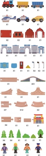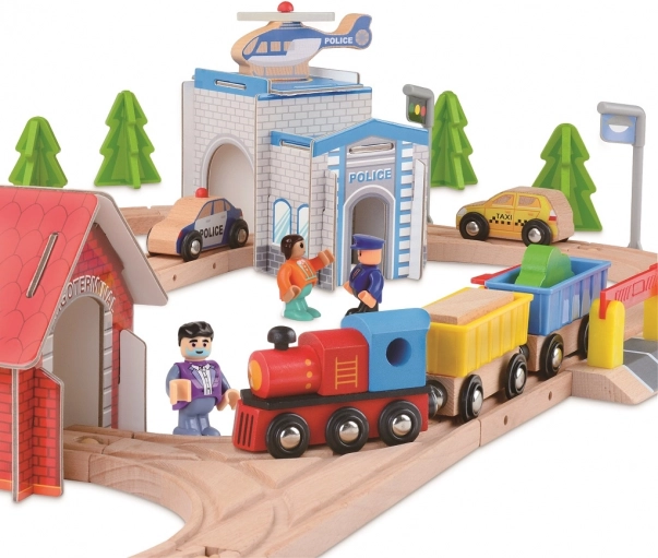 Deze gedetailleerde treinbaan biedt een complete wereld op rails: locomotief met wagons, auto’s, figuurtjes, politiebureau, helihaven, bomen en verkeerstekens. Kinderen kunnen ladingen vervoeren, over de verhoogde brug rijden, bij het station stoppen en veilig de overweg met slagbomen passeren. Elke rit verandert in een nieuw verhaal en ontwikkelt logica, oog-handcoördinatie en communicatie tijdens samen spelen.