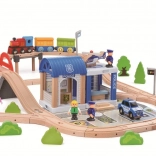 Deze moderne houten treinbaan met het thema van een bruisende stad biedt kinderen alles wat ze nodig hebben voor urenlang fantasierijk spel. De set bevat een blauwe trein met drie wagons, diverse rails inclusief een verhoogde overbrugging en een ruim station met overkapping. Een politieauto, figuurtjes, verkeersborden, lampen, bomen en andere accessoires creëren de sfeer van een echte stad.