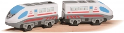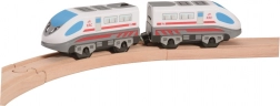 Moderne hogesnelheidstrein op batterijen voor houten treinbanen die elke kleine machinist zal verrassen. Stijlvolle blauw-witte set met realistische details, magnetische koppeling en zelfstandig rijden biedt veel actie en stimuleert fijne motoriek, coördinatie en fantasie. Compatibel met de meeste gangbare houten rails.