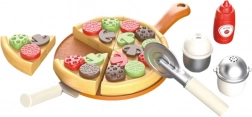 Houten/kunststof pizza met segmenten en afneembare toppings, een pizzasnijder en serveerspatel stimuleren creativiteit en fijne motoriek.