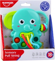- Sensorische rammelaar olifant, beweegbare kralen en ringetjes, gekleurde trekkoordjes