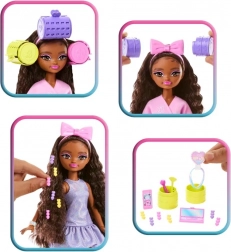 BARBIE Dream Besties Brooklyn is een modieuze pop die kinderen inspireert tot zelfexpressie via mode, kapsels en make-up. Voor het grote optreden kan ze zich “verwennen” in een zachte badjas met komkommermasker, terwijl jij het kapsel voorbereidt met speldjes, elastiekjes en haarkrijt. Daarna trek je de glinsterende jurk aan, maak je de look af met accessoires en klaar voor plezier!